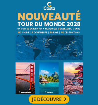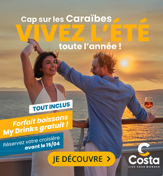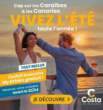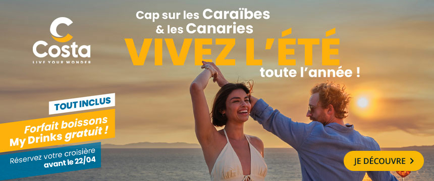 Pour votre prochaine croisière en Méditerranée, aux Caraibes, en Grèce ou en Europe du Nord, PromoCroisiere vous propose les offres de la compagnie Costa Croisière et ses bateaux d’une qualité exceptionnelle : le Costa Pacifica, le Costa Fascinosa… Vous profiterez des meilleures escales, avec des départs réguliers toute l'année. Découvrez l’ambiance des bateaux de croisières avec les nombreuses activités prévues à bord, les spectacles, l’équipe d’animation… Les amateurs d’art et de décoration originale seront ravis d’embarquer sur le Costa Deliziosa et le Costa Favolosa, avec leur univers unique.